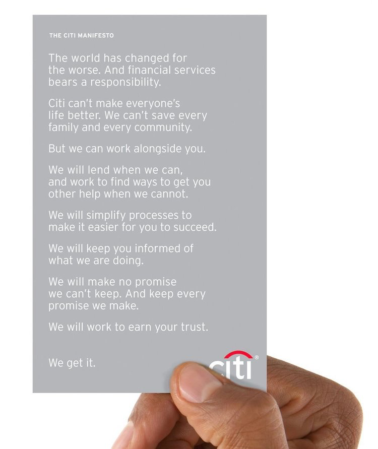 The Citi Manifesto would appear in print and online. Be handed out to every customer after every transaction. And form the basis of the whole of Citi’s new approach.