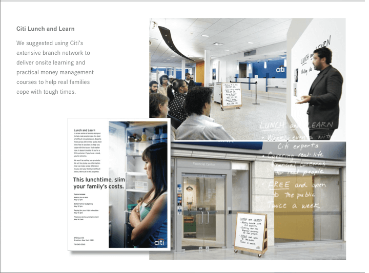 Citi employs some pretty smart people. So why not tap into that resource and have the brightest offer regular “Lunch and Learn” sessions in this underused space? Teaching financial skills to help people cope through tough times. It would demonstrate Citi’s commitment to the local community without adding to capital expense.