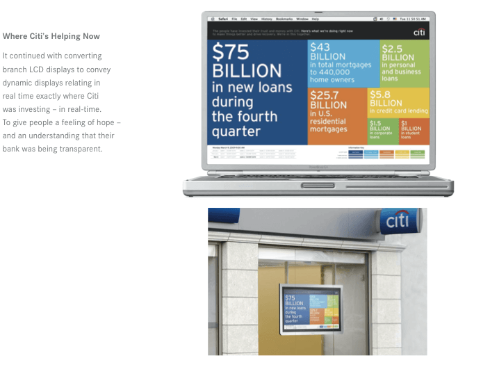 One continuing question throughout the financial crisis was what banks were doing with money received through the US Government’s TARP Program. So we proposed displaying the new sense of responsibility and community partnership, promised in the manifesto, through real-time updates, on web, in app and in retail bank windows. Building transparency and community trust.