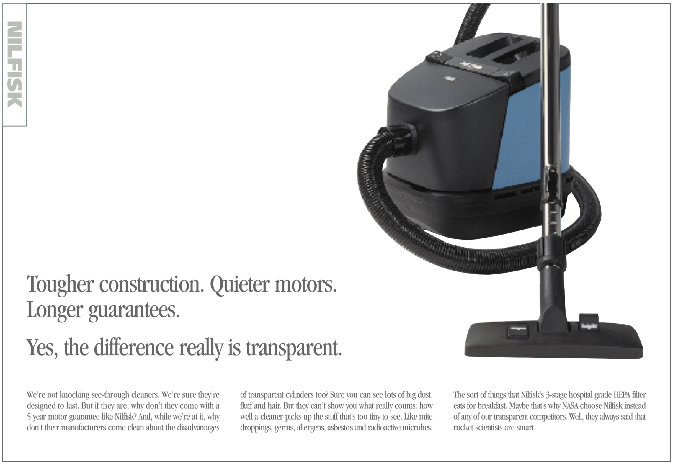 Low-cost, no-nonsense print, banner and broadcast for an industrial vacuum cleaner looking to take on Dyson in the domestic market. Dyson had the transparent bodies and flashy colors. But our brand had hospital-grade filters, quieter motors and general indestructibleness. Nilfisk was tough. Not trendy. It got the job done.